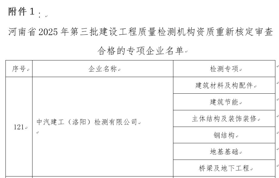 此次资质核定通过,不仅是对公司过往工作的高度认可,更为未来业务拓展奠定了坚实基础。公司可依法承接工程质量检测项目,进一步提升市场竞争力,为服务河南省建设工程质量安全提供更有力的技术支撑。